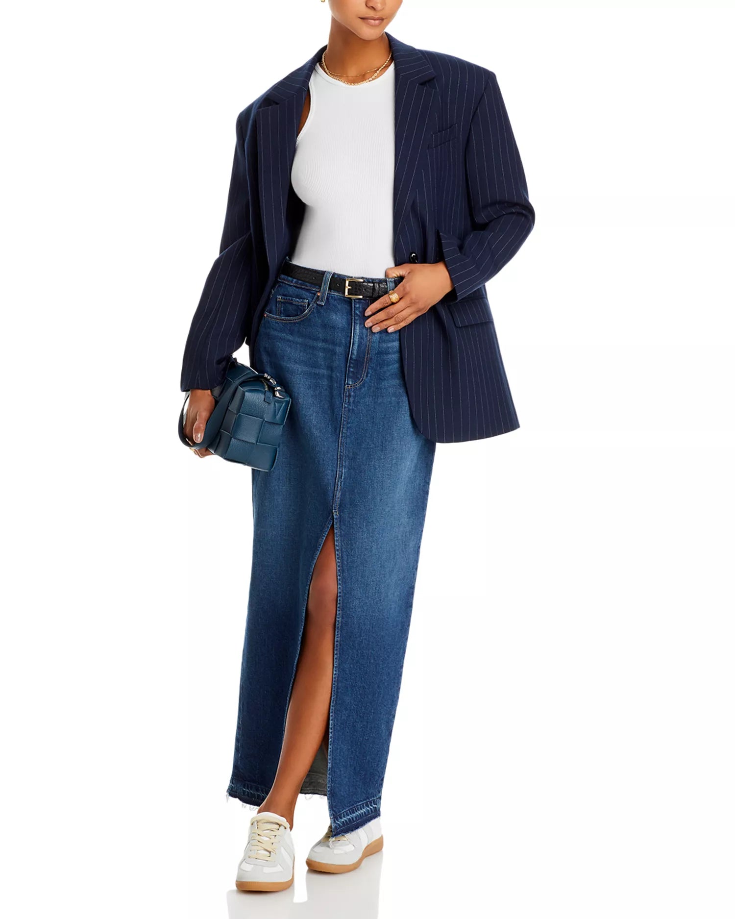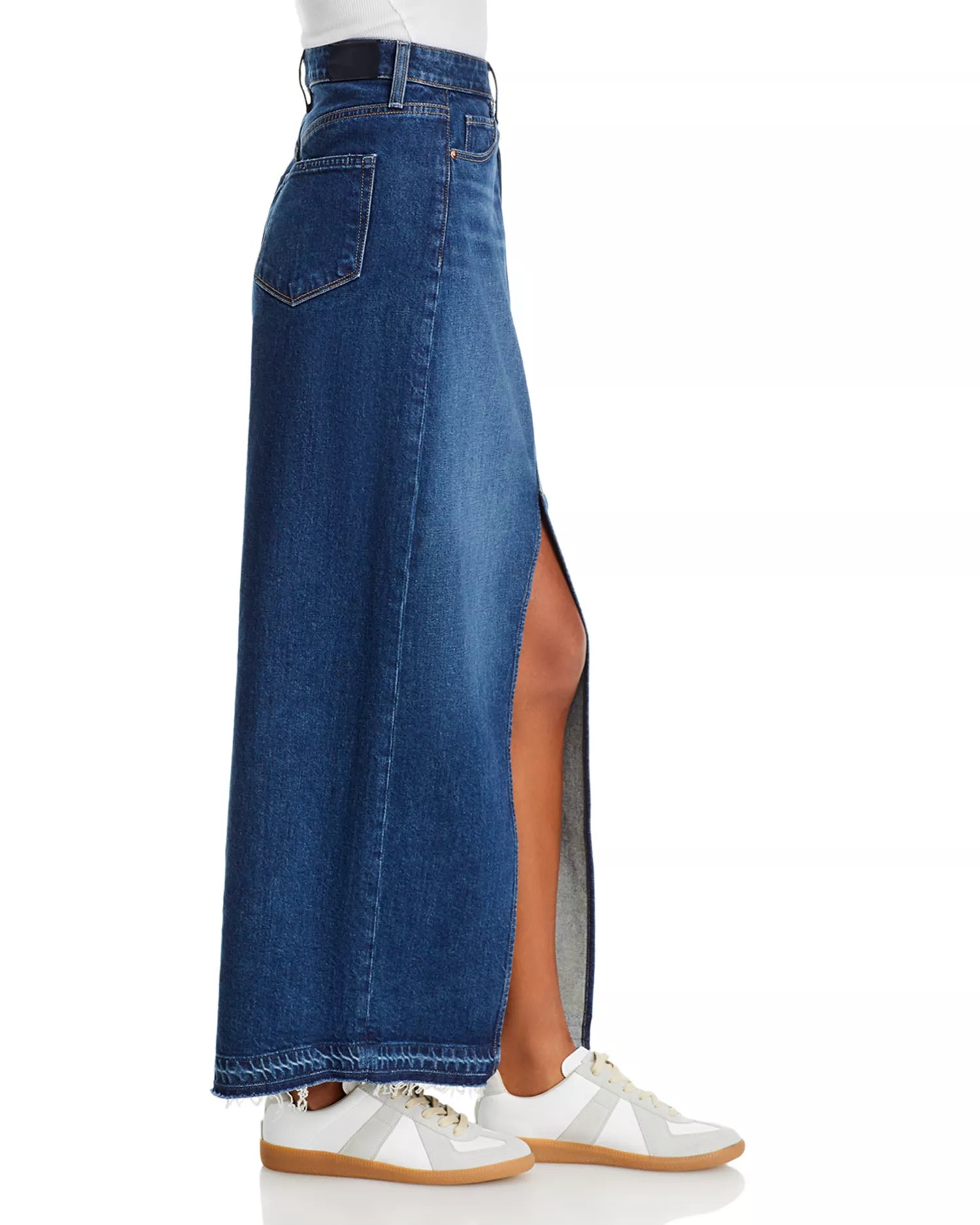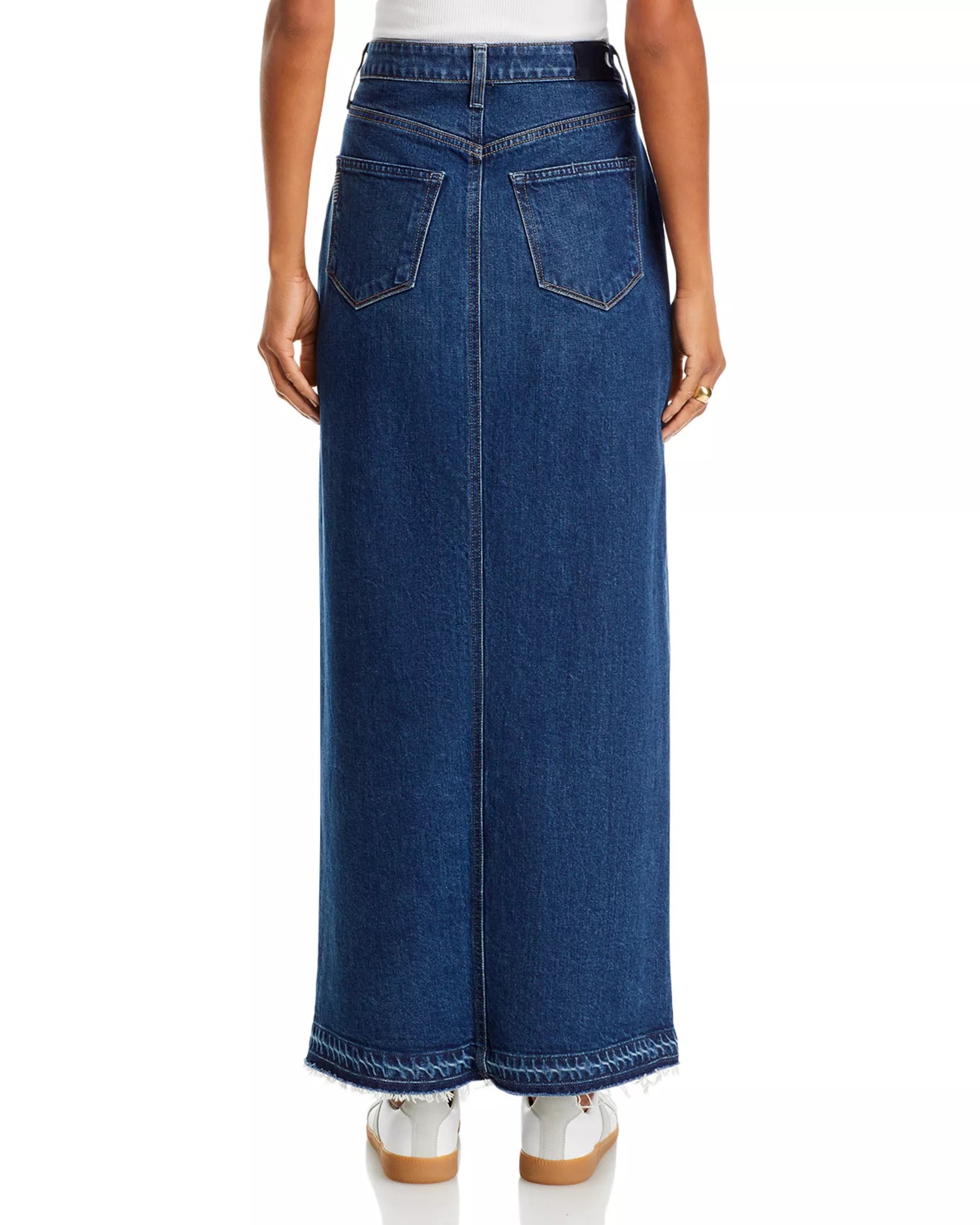 The Angela Maxi Skirt by Paige is a high-waisted, straight-cut long denim skirt crafted from ultra-soft denim with a touch of stretch for added comfort. It features a dark everyday wash, a front slit, and a raw hem.