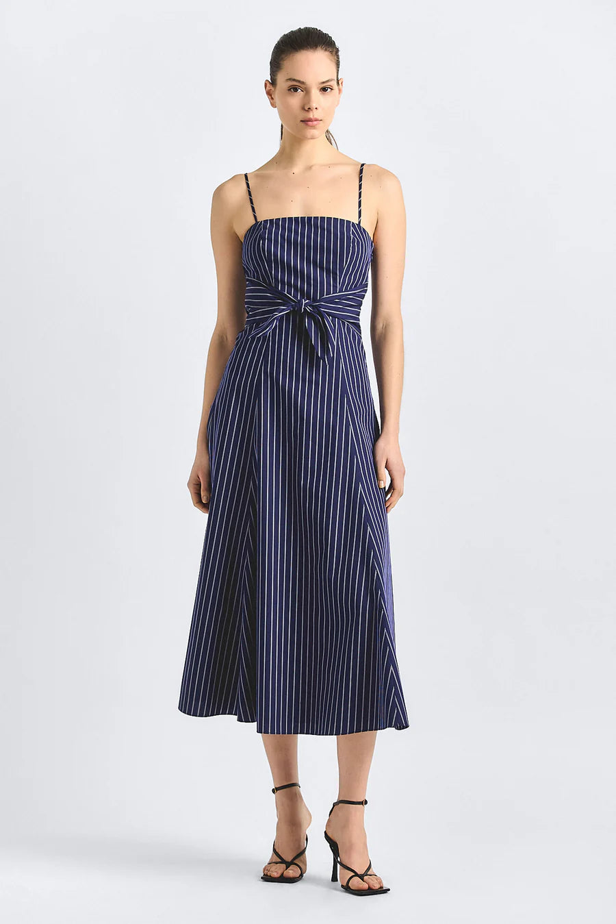 A tailored feminine style. This pinstripe midi dress pairs clean lines with soft structure, featuring a fitted bodice, delicate straps, and a knotted tie detail that defines the waist with effortless ease.